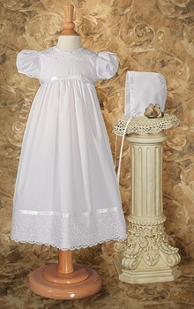 | product description Sweet Christening Dress w/ lace collar and hem. Includes matching bonnet. Handmade of poly cotton batiste. Hand wash gentle. Ships on plastic hanger and poly bag. Available in 3, 6, 12 month. Heirloom preservation bag recommended for long term storage.